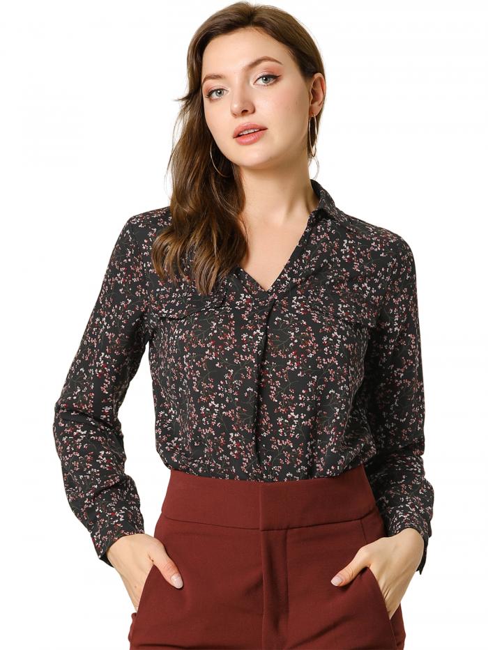ソウテン Allegra K スキッパーシャツ ブラウス 花柄 開襟 Vネック 長袖 フェイクポケット レディース ブラック M