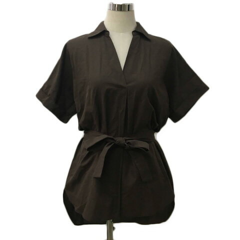 【中古】ルーニィ LOUNIE シャツ カットソー プルオーバー スキッパーカラー リネン混 リボンベルト 無地 五分袖 38 茶 こげ茶 ブラウン ダークブラウン レディース 【ベクトル 古着】 220621