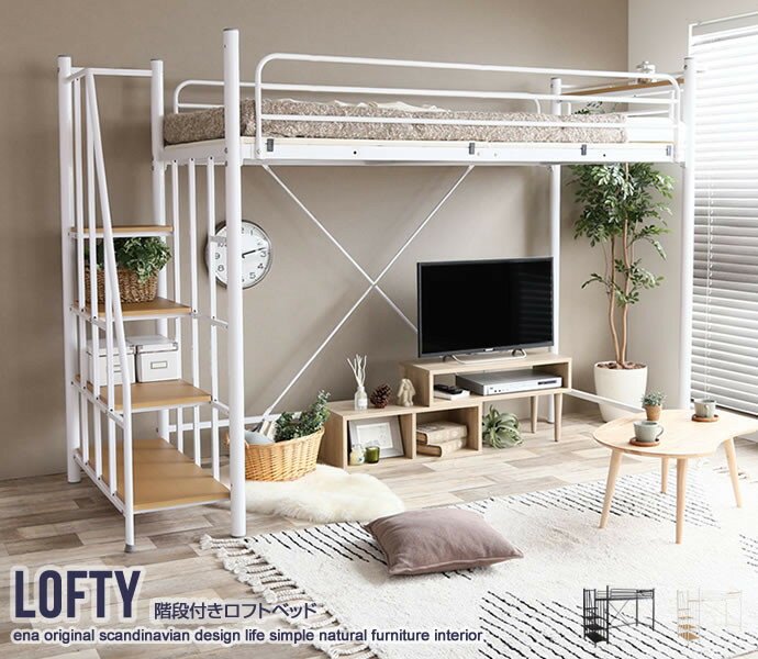 【シングル】 Lofty 階段付きロフトベッド カラー:ホワイト[125001_WH]