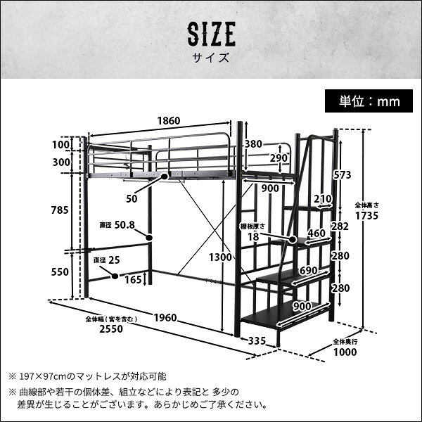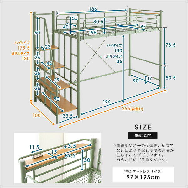【ポイント5.5倍】階段付パイプロフトベッド(4色)、ハイタイプでもミドルタイプでも選べる大容量の収納力 | Rostem-ロステム-【代引不可】 [03]