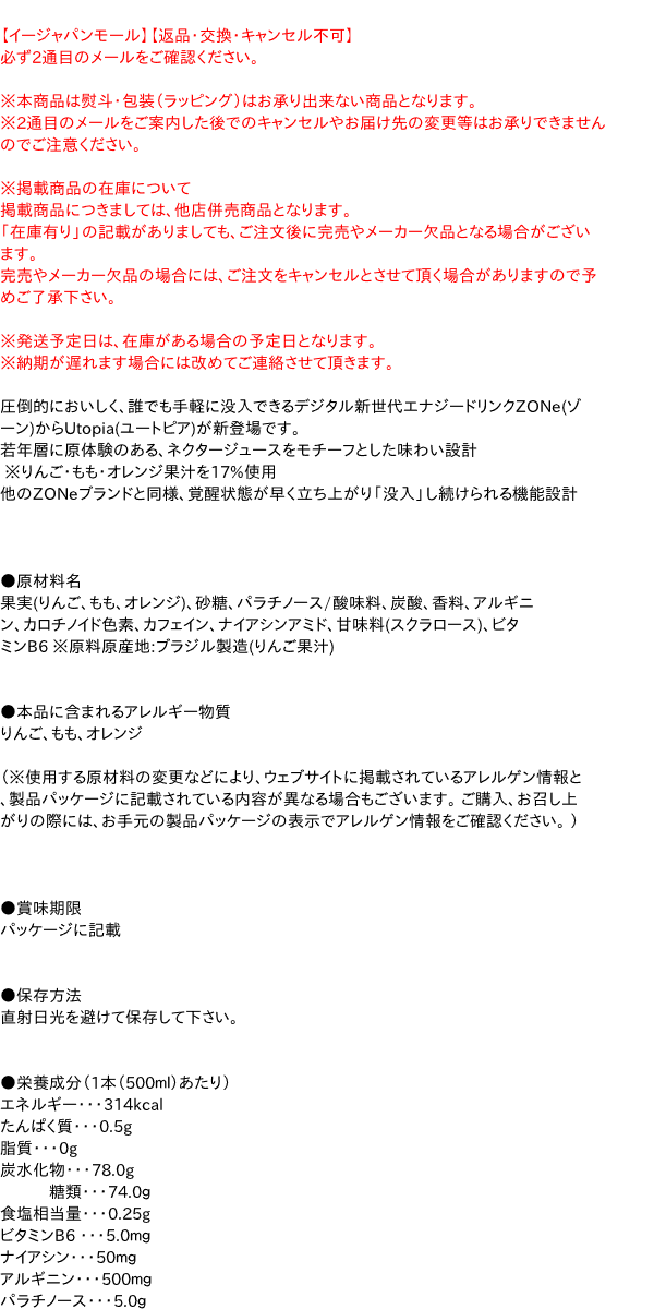 若年層に原体験のある、ネクタージュースをモチーフとした味わい設計 ※りんご・もも・オレンジ果汁を17%使用 他のZONeブランドと同様、覚醒状態が早く立ち上がり「没入」し続けられる機能設計 ●原材料名 果実(りんご、もも、オレンジ)、砂糖、パラチノース/酸味料、炭酸、香料、アルギニン、カロチノイド色素、カフェイン、ナイアシンアミド、甘味料(スクラロース)、ビタミンB6 ※原料原産地:ブラジル製造(りんご果汁) ●本品に含まれるアレルギー物質 りんご、もも、オレンジ (※使用する原材料の変更などにより、ウェブサイトに掲載されているアレルゲン情報と、製品パッケージに記載されている内容が異なる場合もございます。